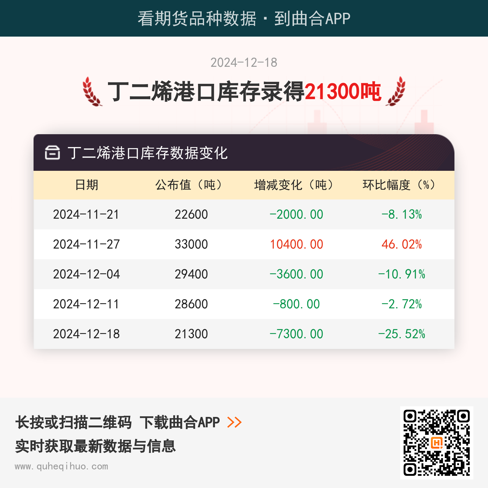 截止12月18日,丁二烯港口库存数据为 21300吨,较上一周减少7300吨,环比跌幅25.52%。 近期丁二烯港口库存数据变化如下:图片来源于网络,如有侵权,请联系删除 橡胶期货实时行情 更新时间:---- 最新价 -- 涨跌值 -- 涨跌幅 -- 点击查看橡胶最新行情走势