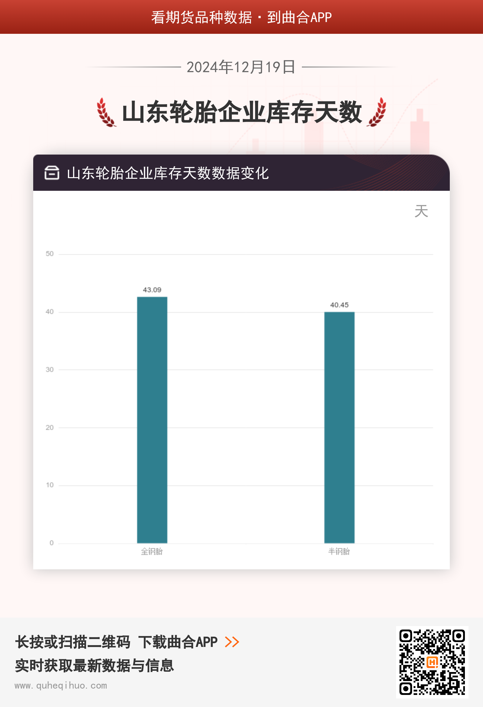 截止12月19日,全钢胎库存天数为 43.09天,较上一周增加1.13天,环比涨幅2.69%。半钢胎库存天数为 40.45天,较上一周增加0.54天,环比涨幅1.35%。