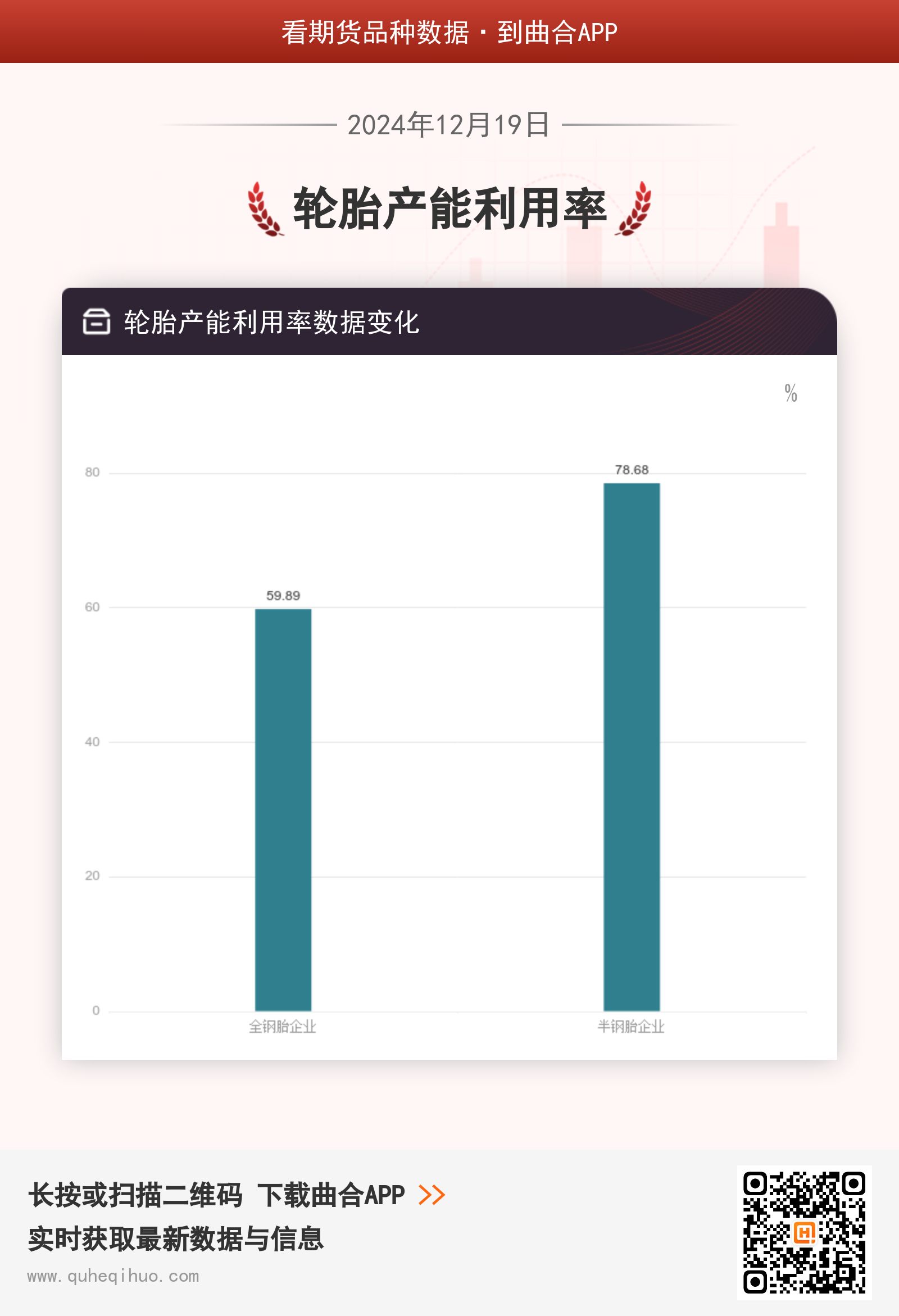 截止12月19日,全钢胎企业产能利用率为 59.89%,较上一周增加1.41%,环比涨幅2.41%。半钢胎企业产能利用率为 78.68%,较上一周增加0.05%,环比涨幅0.06%。
