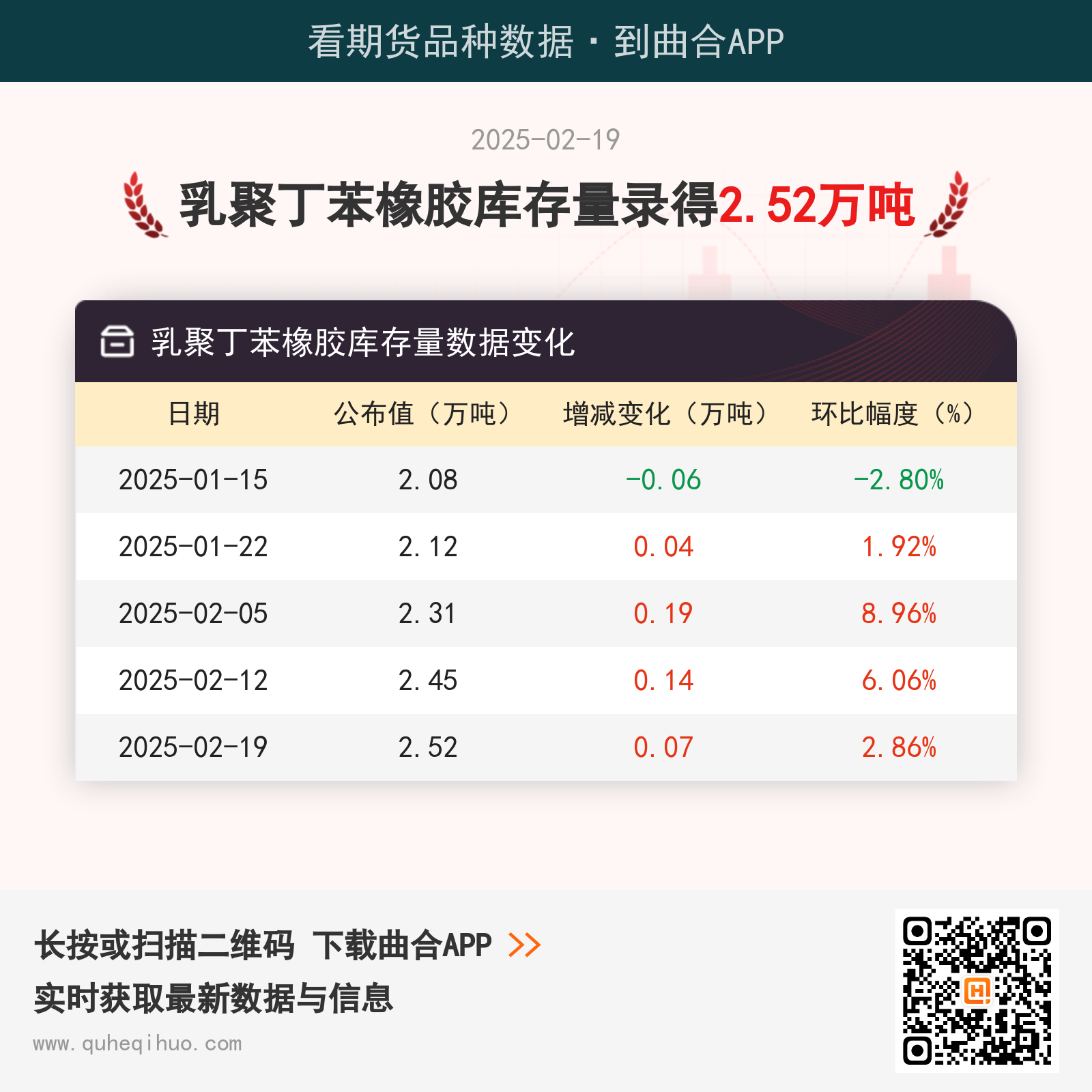 截止2月19日,乳聚丁苯橡胶库存量数据为 2.52万吨,较上一周增加0.07万吨,环比涨幅2.86%。