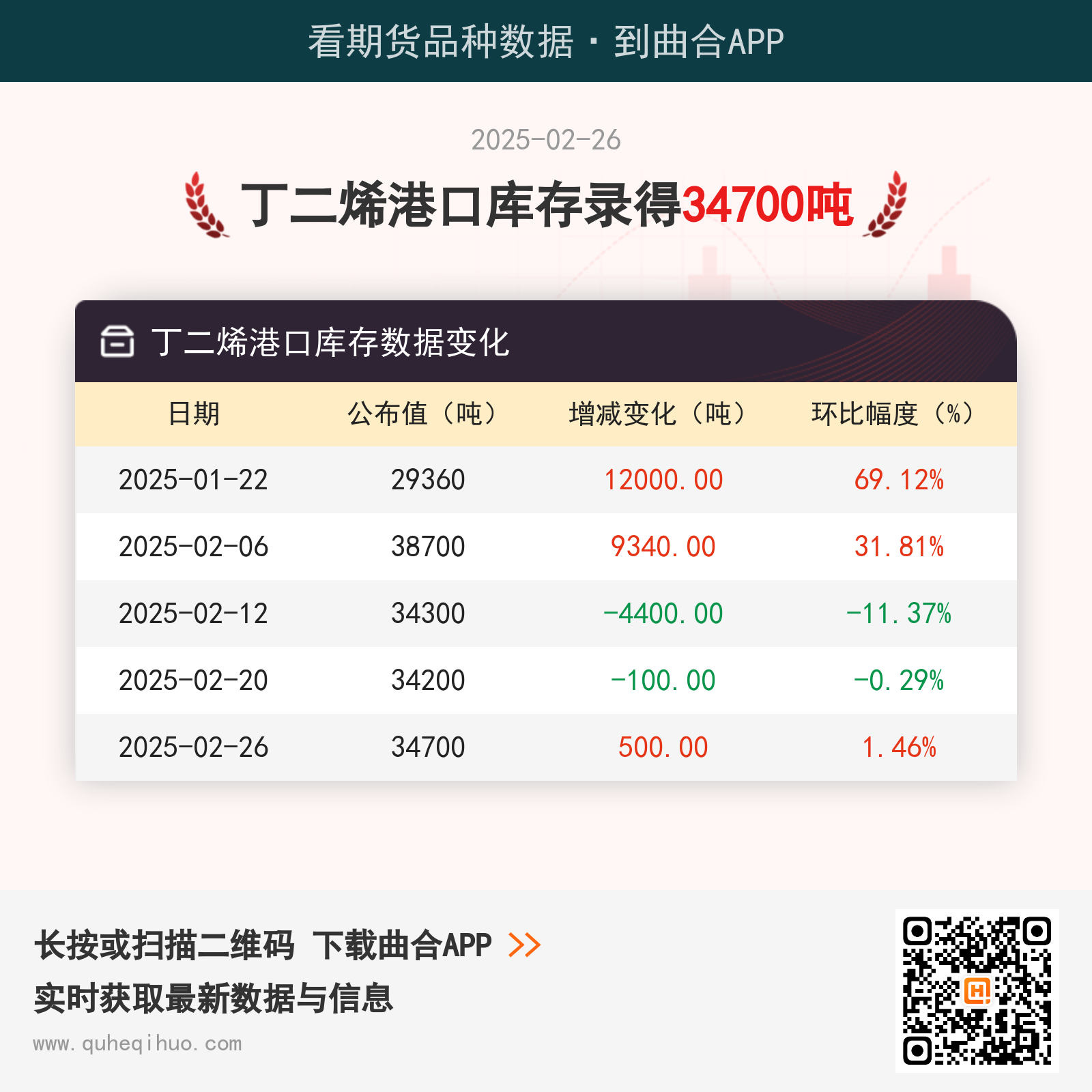 截止2月26日,丁二烯港口库存数据为 34700吨,较上一周增加500吨,环比涨幅1.46%。 近期丁二烯港口库存数据变化如下: 图片来源于网络,如有侵权,请联系删除 橡胶期货实时行情 更新时间:---- 最新价 -- 涨跌值 -- 涨跌幅 -- 点击查看橡胶最新行情走势