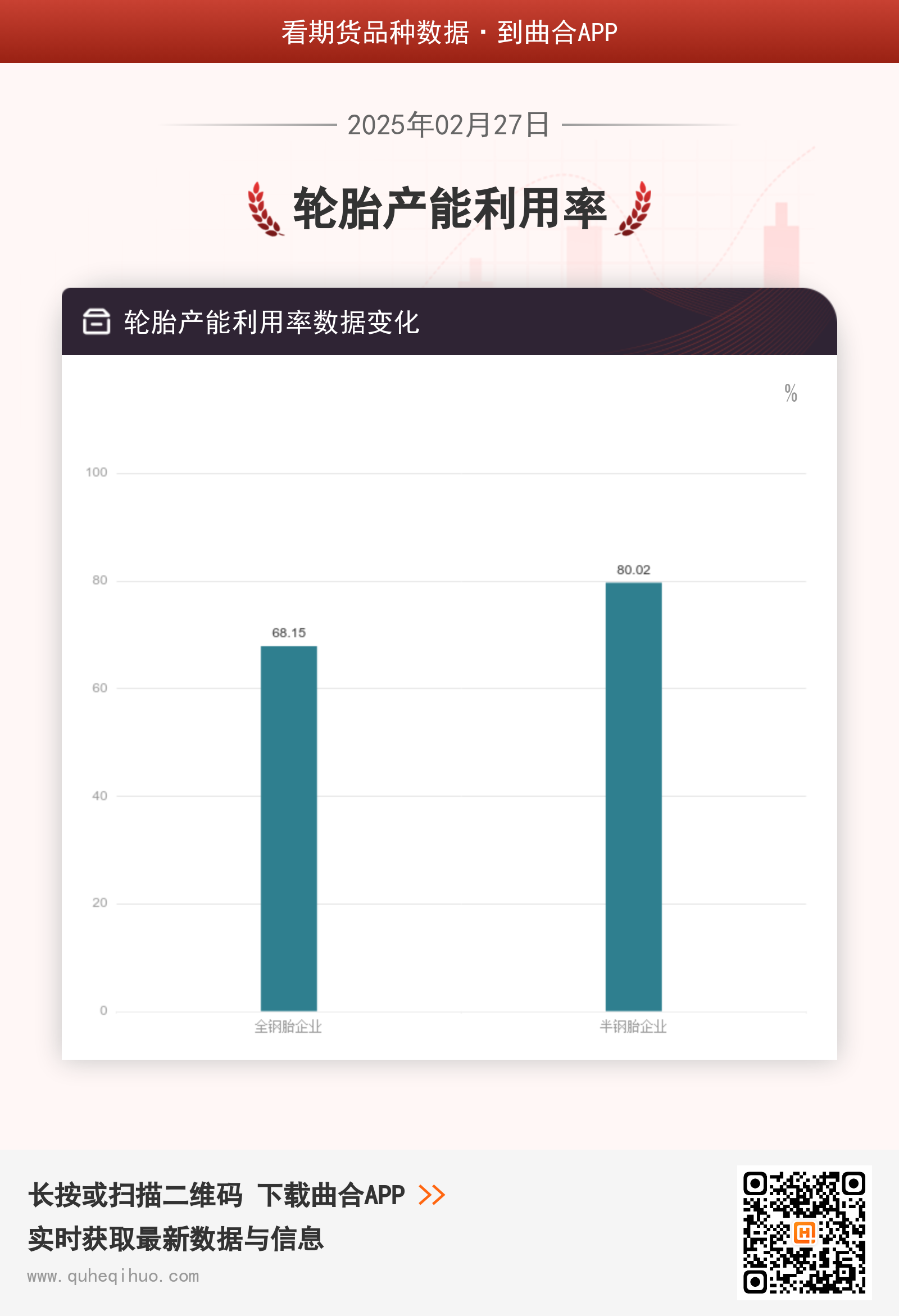 截止2月27日,全钢胎企业产能利用率为 68.15%,较上一周增加1.79%,环比涨幅2.70%。半钢胎企业产能利用率为 80.02%,较上一周增加0.05%,环比涨幅0.06%。