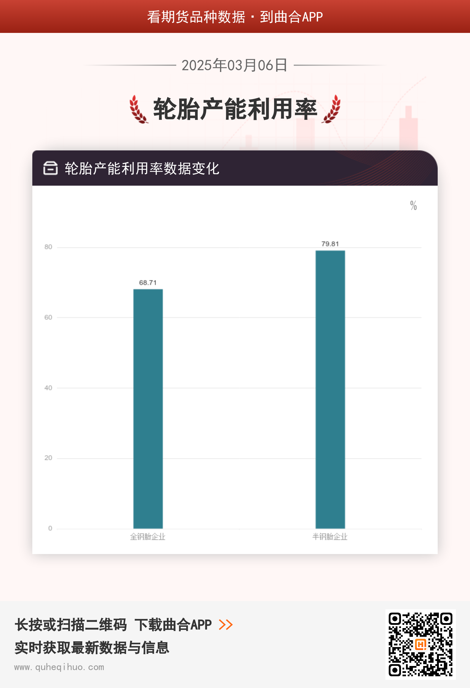 截止3月6日,全钢胎企业产能利用率为 68.71%,较上一周增加0.56%,环比涨幅0.82%。半钢胎企业产能利用率为 79.81%,较上一周减少0.21%,环比跌幅0.26%。