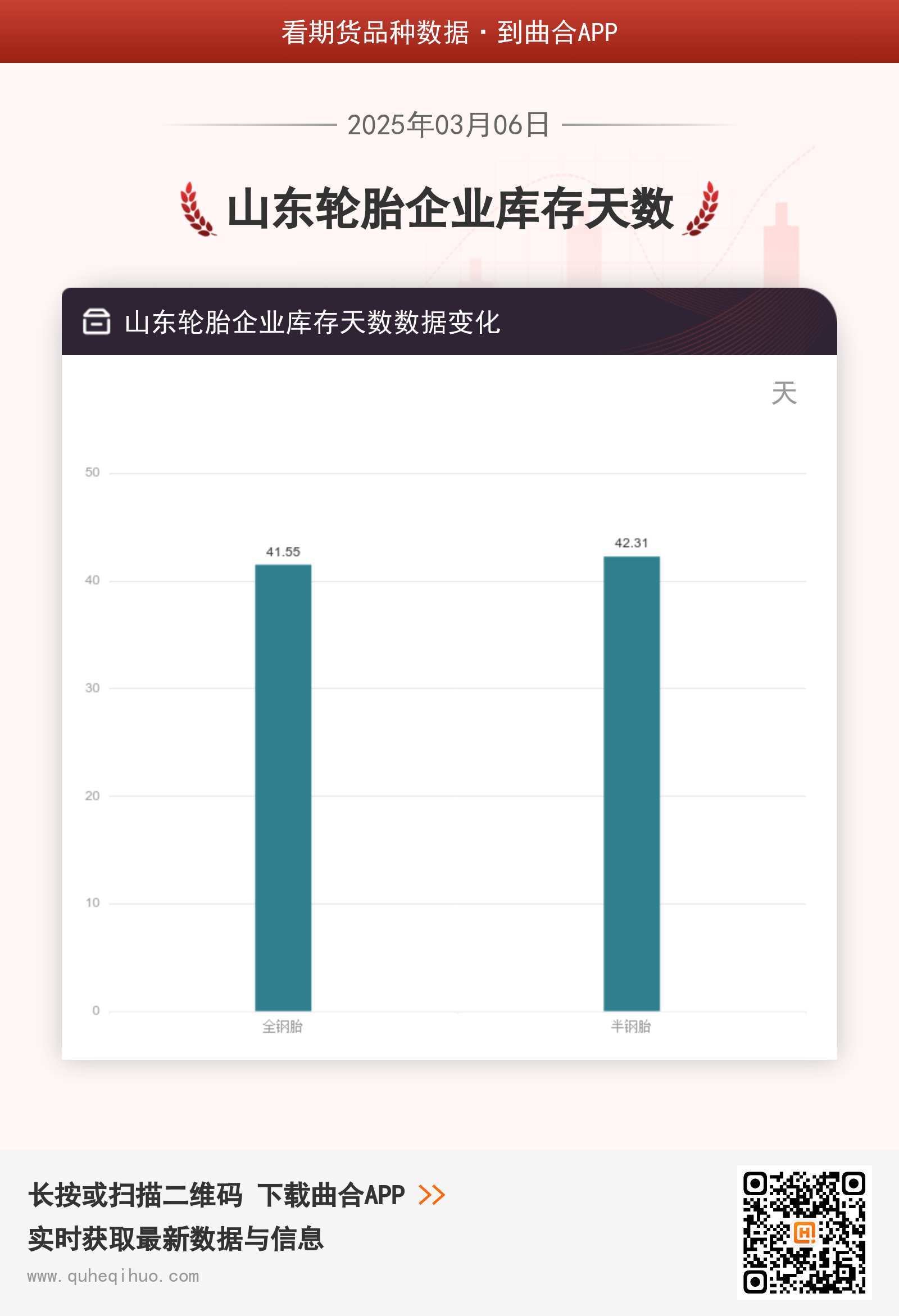 截止3月6日,全钢胎库存天数为 41.55天,较上一周减少1.85天,环比跌幅4.26%。半钢胎库存天数为 42.31天,较上一周增加0.40天,环比涨幅0.95%。